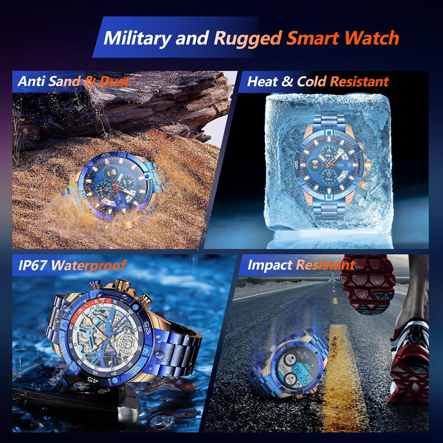 - MILITARY - GRADE TOUGHNESS, TIMELESS STYLE SMARTWATCH-Conquer any adventure with the OHUGNA men's smartwatch! Built with a rugged composite case and IP67 waterproof rating, it laughs off dust, scratches, and splashes. The 1.53" HD screen shines bright outdoors, while its sleek design transitions effortlessly from mountain trails to boardroom meetings