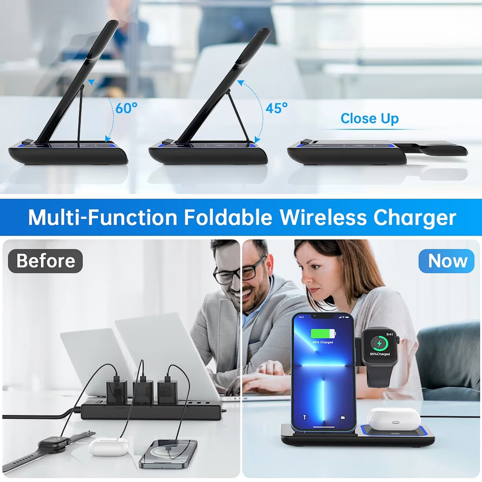 The 3 in 1 wireless charger uses high-efficiency components and advanced chipsets, and the dual-coil design greatly improves the charging speed of the device. Control, foreign body detection, etc, you and your products will be fully protected. .