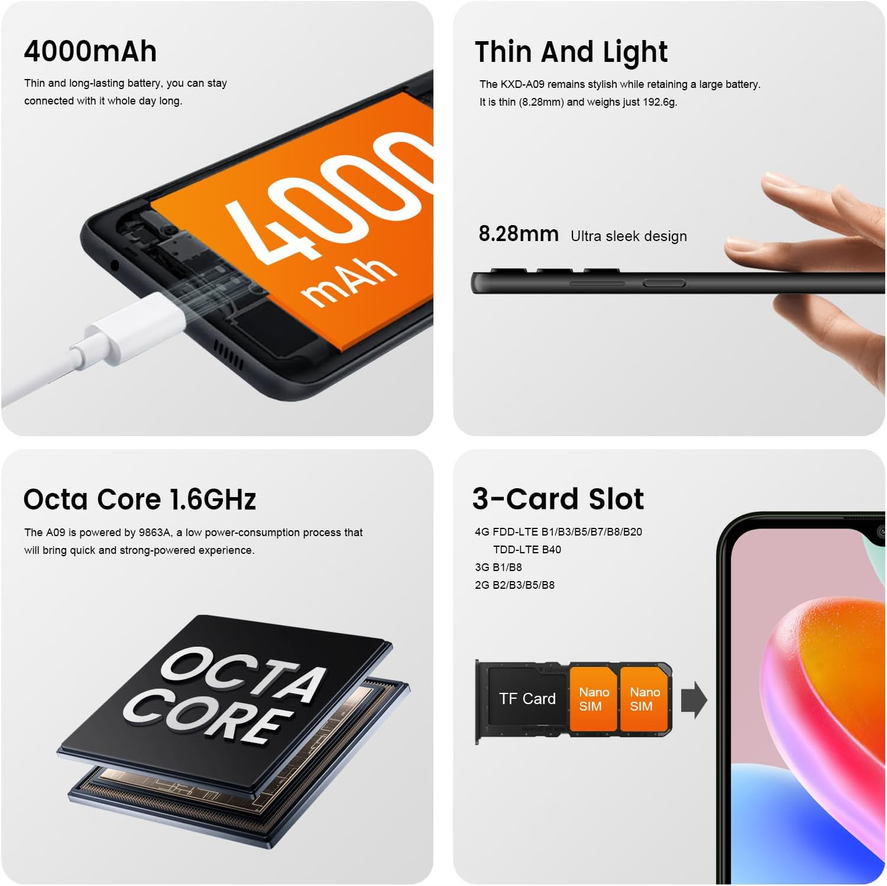 - [Box Content] KXD A09, Screen Protector, Phone Protector Case, User Manual, Charger, USB-C Cable, Sim Key.