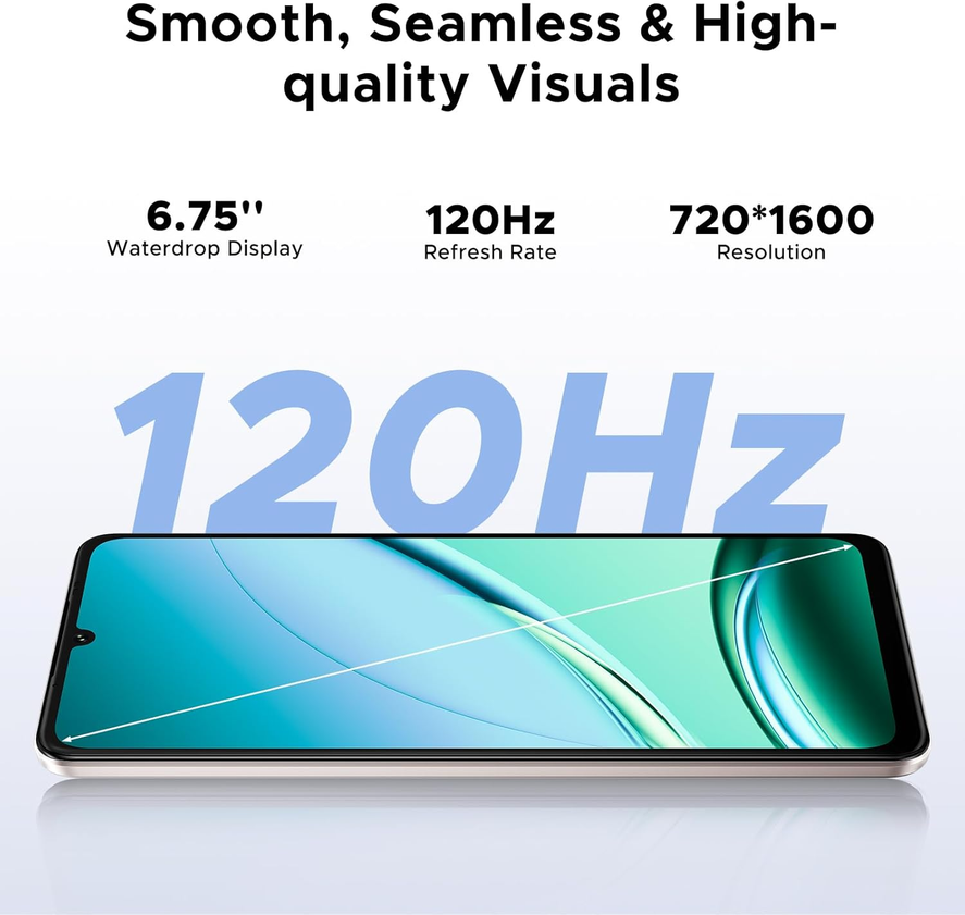 - 【6.75" HD+ 120Hz Display for Fluid Visuals】Enjoy a smoother visual experience with the 6.75-inch HD+ IPS waterdrop screen on this android 15 phone.Featuring a 120Hz refresh rate, 260 PPI pixel density, and 450 nits brightness,this display delivers crisp, vivid visuals whether you're scrolling social media or watching YouTube.With a 20:9 aspect ratio and in-cell screen tech, this android phone offers an immersive viewing experience while maintaining a slim design.It's the ideal unlocked cell phone for streaming, gaming,or reading.