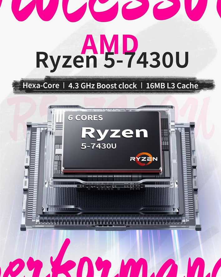 - ➤【Processor+ Graphics】AMD Ryzen 5 7430U (6 Cores, 12 Threads, 16MB L3 Cache, 2.4GHz base frequency, up to 4.30GHz max turbo frequency), with AMD Radeon Graphics —— smooth visuals, making it perfect for business presentations, graphic design work, and media consumption.