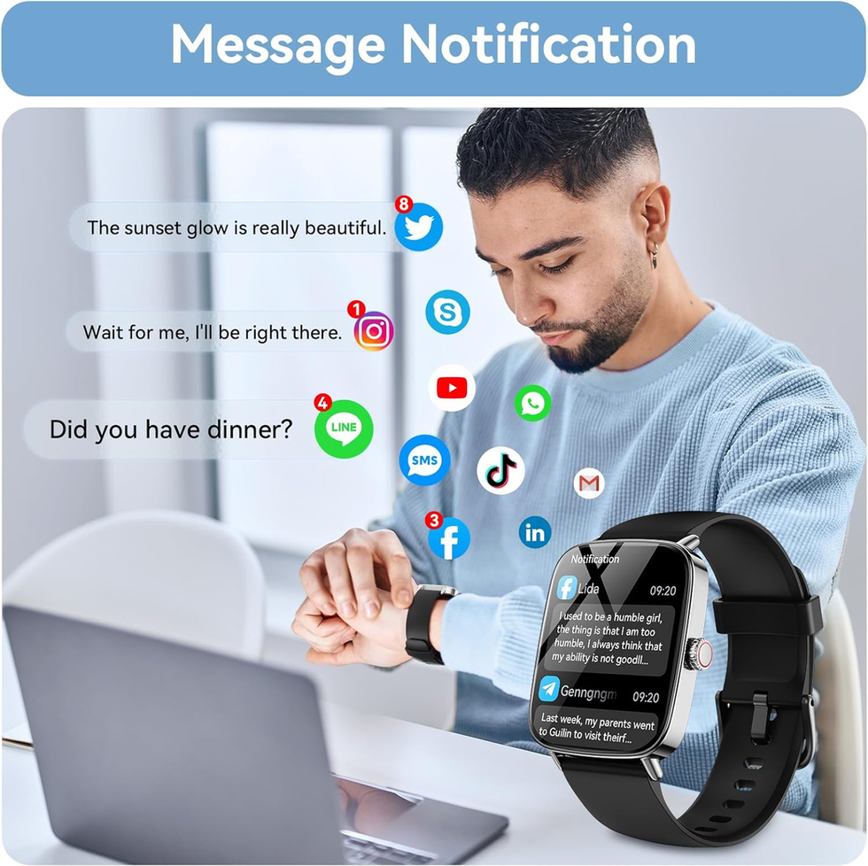 - 【Make Call and Message Notifications】Powered by the latest Bluetooth 5.3 technology, more stable and reliable connection between smart watch and phone. Can answer and make calls smoothly and clearly and receive information at any time from Facebook, Whatsapp, Instagram, SMS, etc. Never miss important alerts—whether you're working out or exercising (Note: Text reply function is not supported)